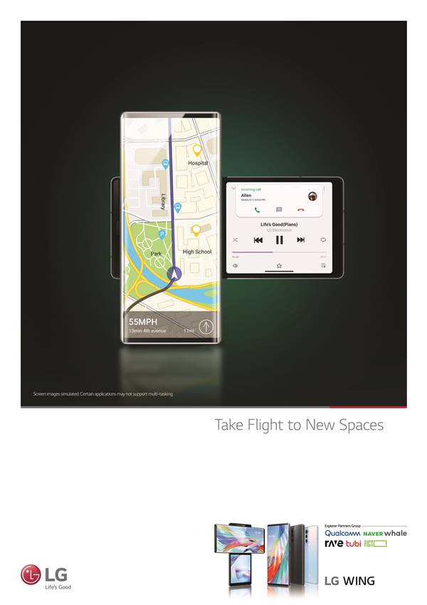 Üst üste gelen çift ekrana sahip LG WING, “Temel Mod” ve “Döndürme Modu” olmak üzere iki farklı moda sahip. Döndürme Modunda, telefonun ön yüzü saat yönünde 90 derece dönerek Ana Ekranı yatay moda yönlendiriyor.